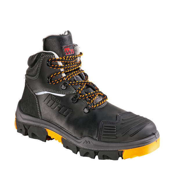 Zehenschutz und Durchtrittschutz metallfrei, seitliche Sichtreflektoren, abriebfeste, nicht kreidende TPU-Überkappe, Nitril/PU-Laufsohle leuchtend, hitzebeständig bis max. 300 °C